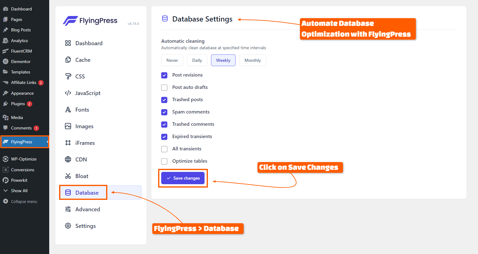 - Go to FlyingPress > Database and enable automated cleanups.