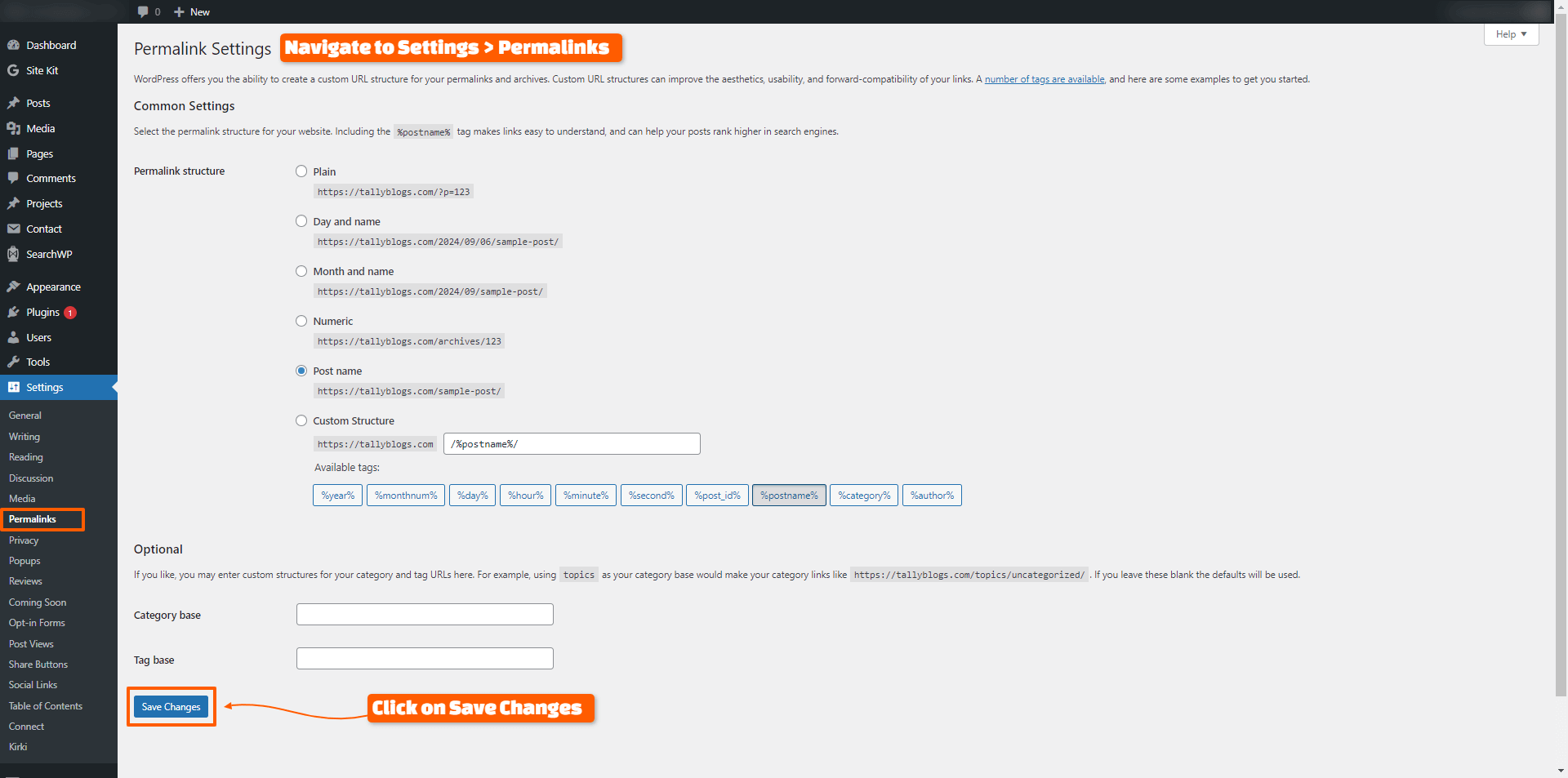 - Go to Settings > Permalinks in your WordPress dashboard and click Save Changes to generate a new .htaccess file.